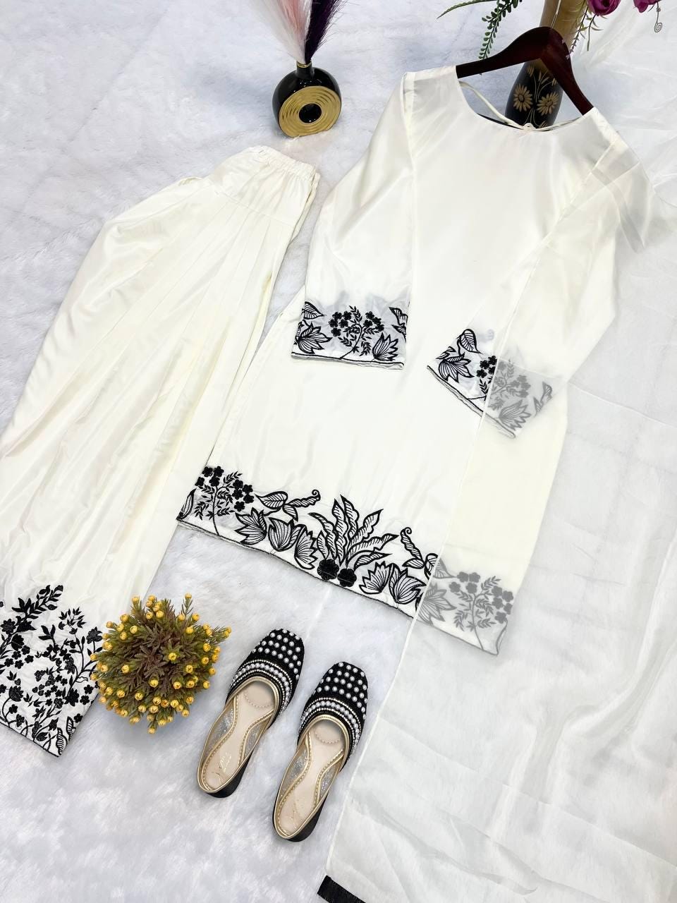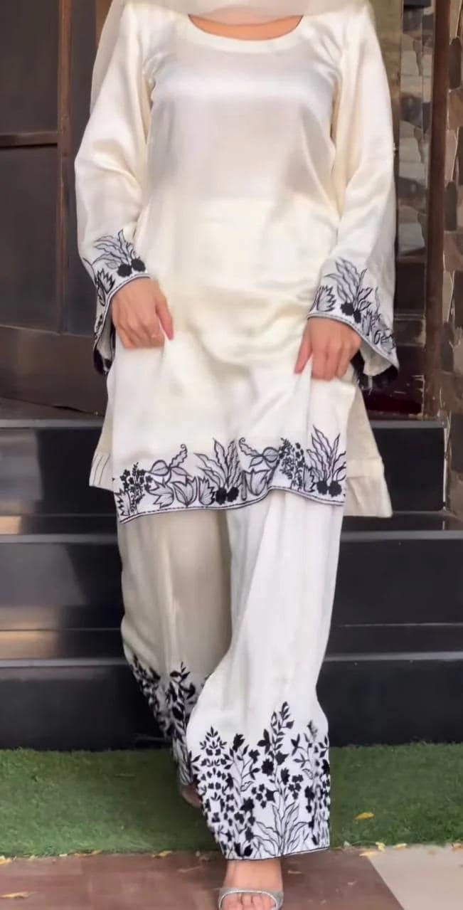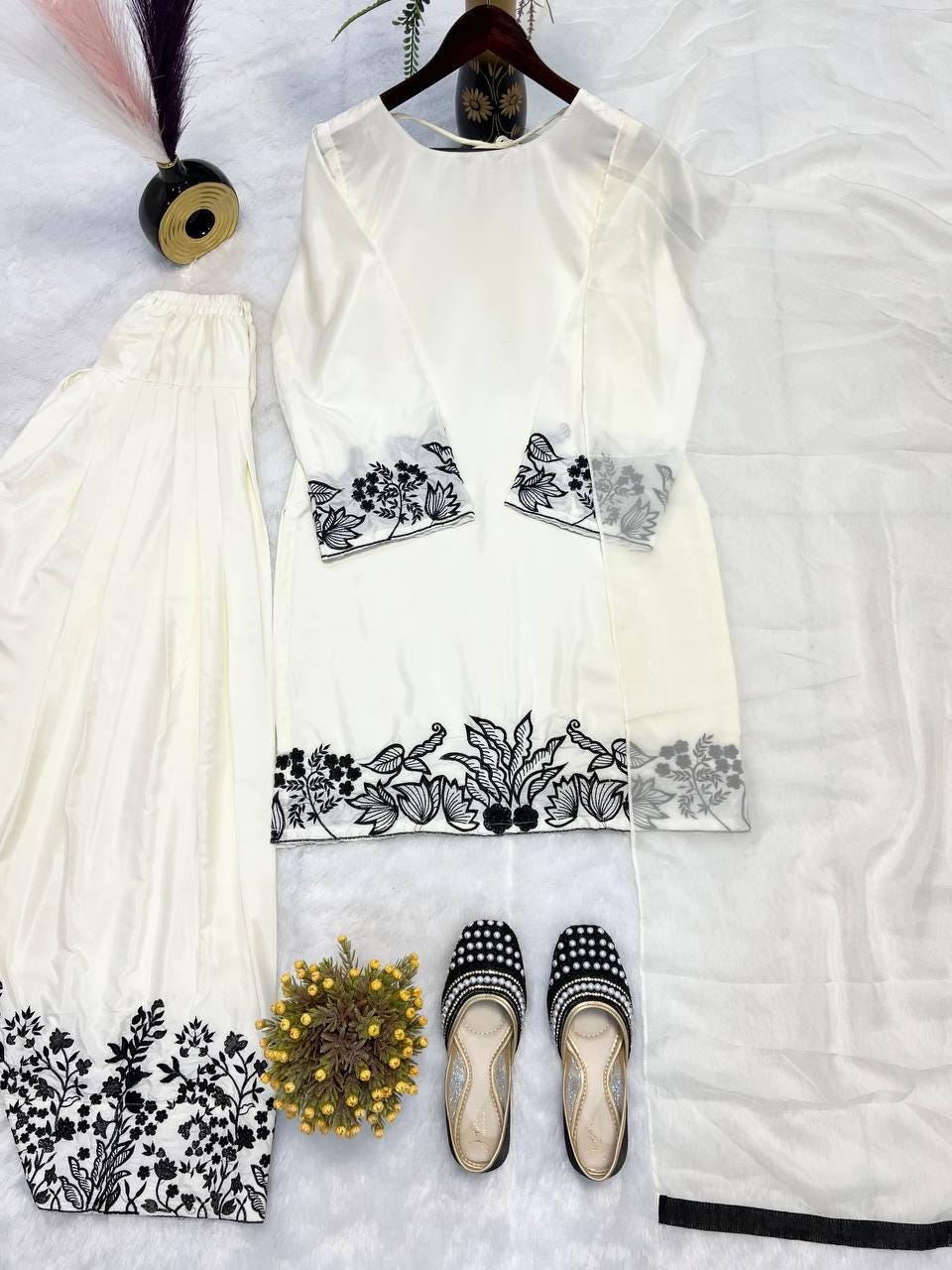 Step into elegance with this White & Black Farshi Salwar Suit from Zariiyaa. Crafted in natural crepe silk with detailed multi-needle embroidery and zari work, this outfit is perfect for parties, festive events, and cultural gatherings.