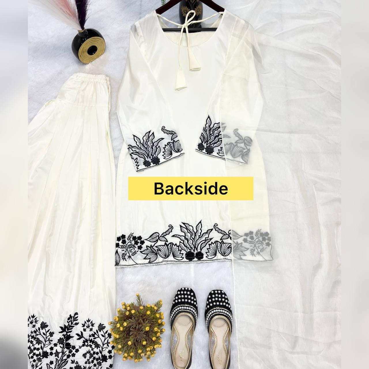 Color: Off-white with black embroidery