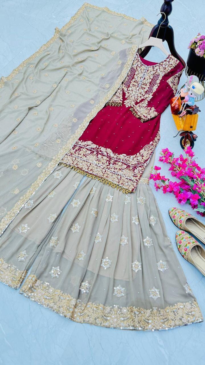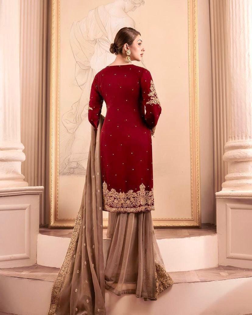 Maroon Embroidered Georgette Palazzo Suit Indian Wedding Outfit