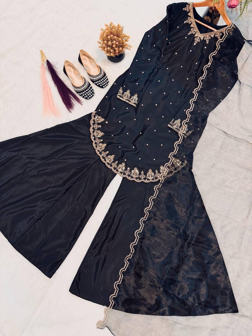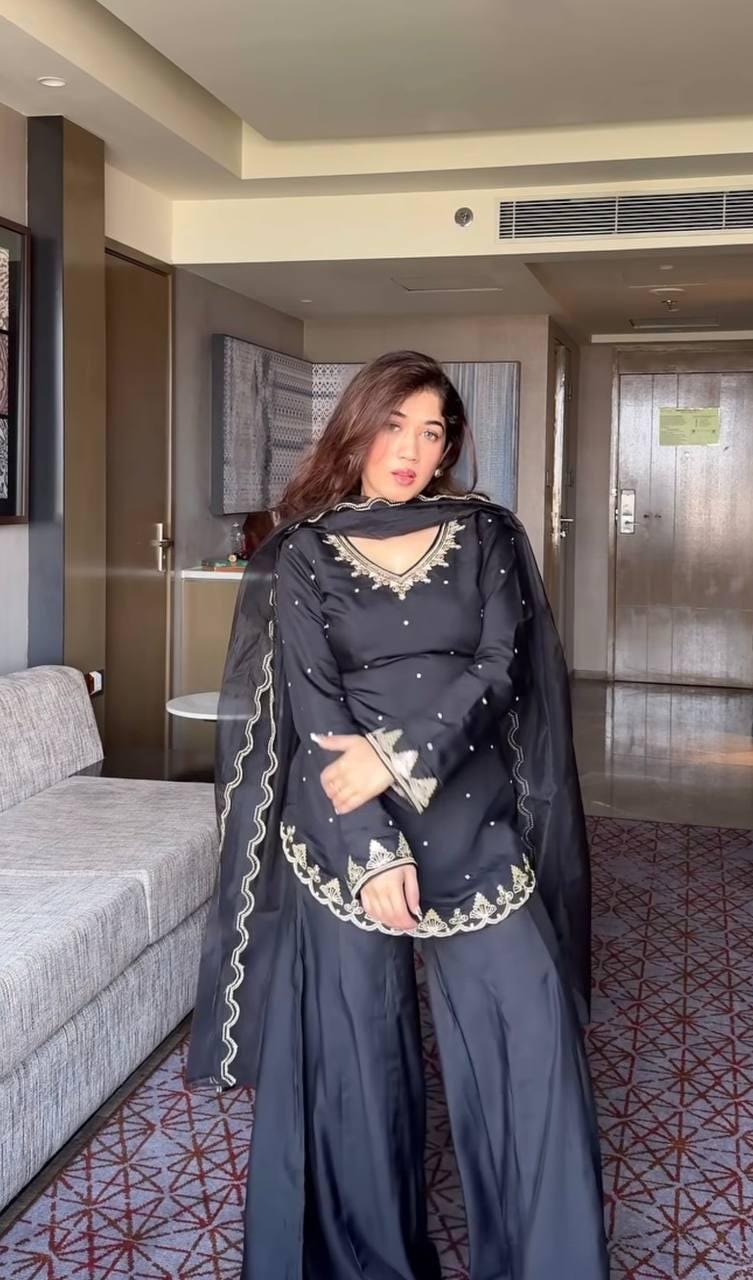 Elevate your festive wardrobe with this elegant Black Sharara Suit Set, crafted in luxurious natural crepe silk with intricate embroidery and sequin detailing.