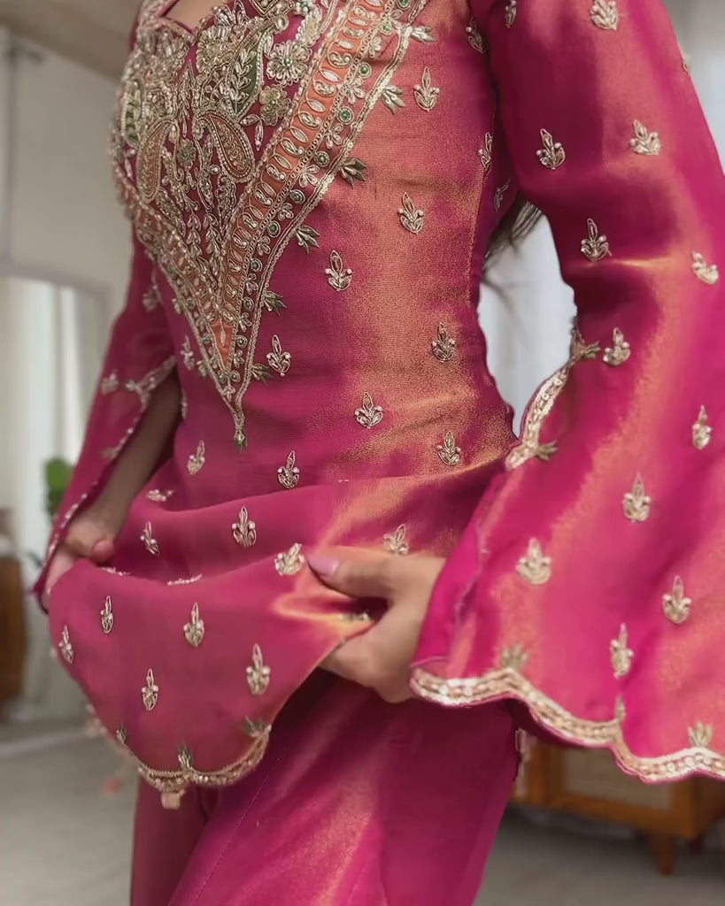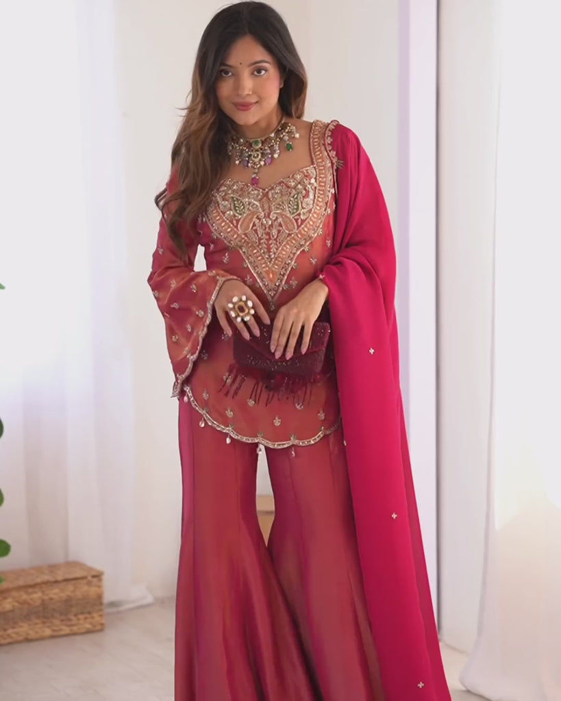 Elevate your festive and wedding look with this stunning maroon-pink sharara set featuring intricate embroidery, statement sleeves, and a flowy silhouette. Designed for the modern woman who embraces tradition with style.